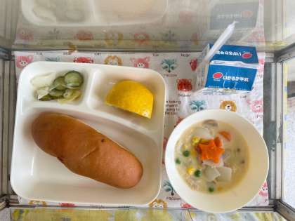 【レーズンパン、牛乳、コーンクリームシチュー、キャベツときゅうりのサラダ、かわちばんかん】