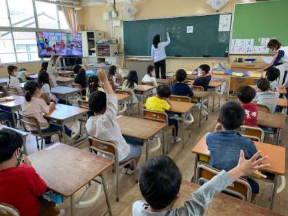 5月10日(月)3時間目、1年1組は国語でひらがなの「め」を学習していました。「め」のつく言葉として、子どもたちから「めだか」「めいろ」「め」等発表がありました。