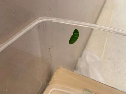 5月10日(月)3年生の教室の前のアゲハチョウの幼虫がさなぎを作り始めています。