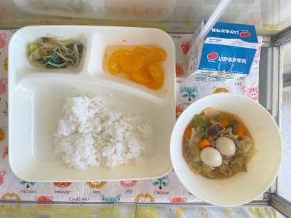 【ごはん、牛乳、八宝菜、チンゲンサイともやしのしょうがあえしょうがあえ、みかん(缶)】