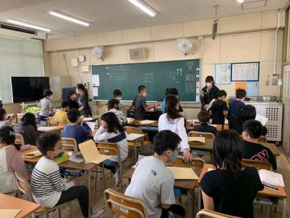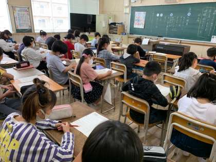 5月11日(火)3時間目、5年1組はテストの返却をしていました。2組はプリントの答え合わせをしていました。