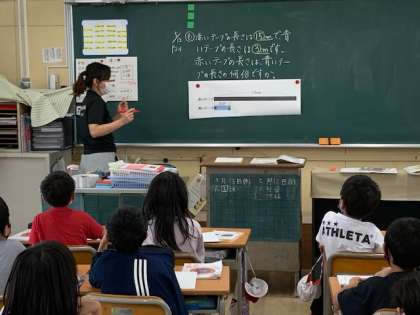 5月12日(水)4時間目、3年は1組も2組も算数で「何倍かをもとめる計算について考えよう」というめあてで学習していました。赤いテープと青いテープの長さを比べていました。