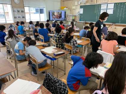 5月14日(金)4時間目、4年1組は国語で「ヤドカリとイソギンチャク」を学習していました。なぜヤドカリの上にイソギンチャクが付いているのか自分の考えを発表した後、段落に分けて読み取りをしていくようです。「形式だん落」という言葉を国語辞典で調べていました。