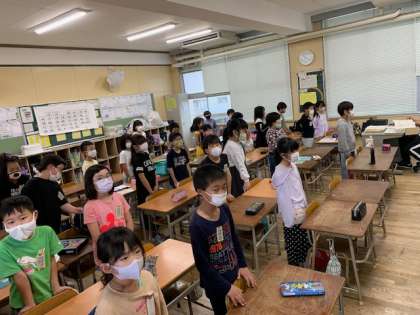 3年2組は全員で「友だち」の歌を歌っていました。みんなで声を合わせると気持ちがいいですね。その他の学級では先生のお話を聞いたり、プリントを配ったりしていました。その後、家庭学習の振り返りが始まります。