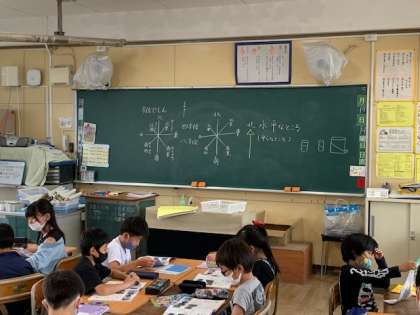 5月17日(月)4時間目、3年1組は社会科で、「まちたんけんと絵地図づくり」の学習をしていました。方角の言い方も学習したようです。