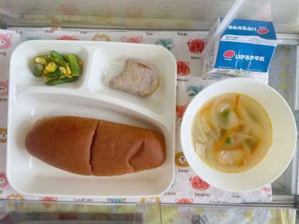 【黒糖パン、牛乳、かつおのガーリックマヨネーズ焼き、ベーコンと野菜のスープ、グリーンアスパラガスのソテー】