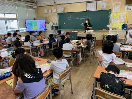 5月20日(木)1時間目、3年1組は社会科で大阪市の地形のようすや土地の使われ方について学習していました。普段飲んでいる水が淀川の水だとわかると、「ヘー」という顔をしていました。