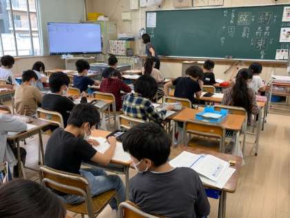 5月20日(木)1時間目、4年1組は国語で「ヤドカリとイソギンチャク」を学習していました。新出漢字を練習した後、段落に分けて学習を始めているところでした。