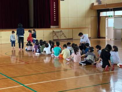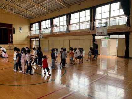 5月20日(木)3時間目、1年生は体育館で体育をしていました。2列や4列の並び方の練習をしています。しばらく並ぶ練習をしていなかったので、なかなかうまくいきません。これから体育の時間に練習していくとサッとできるようになるのでしょうね。