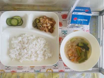 1〜5年生【ごはん、牛乳、ホイコウロー、中華スープ、きゅうりのピリ辛あえ】