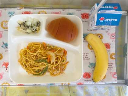 【黒糖小パン、牛乳、カレースパゲッティ、キャベツのひじきドレッシング、バナナ】