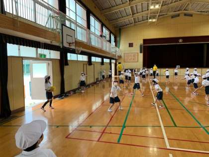 5月24日(月)2時間目、1年生は体育館で体育をしていました。班に分かれてボールを投げたり、受けたりする練習をしていました。
