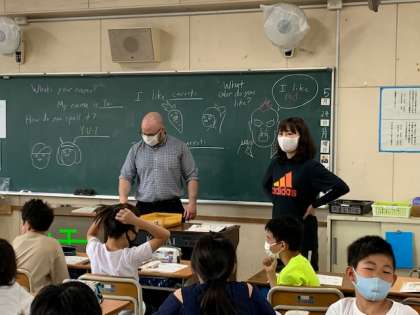 5月24日(月)2時間目、5年1組は外国語科で「What your name?」「My name is 〇〇.」を学習した後、I LIKE〜を学習していました。近くの友達に「What color do you loke?」と聞いて、色を答え、好きな色が同じ人が3人集まればすわるというゲームをしていました。