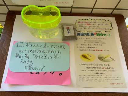 5月25にち(火)「謎の土」の正体は、住吉大社の田んぼ「御田」の土でした。水を入れると、うまくいくと、生き物を見ることができるかもしれません。明日の朝、水に謎の土を入れたいと思います。お楽しみに!