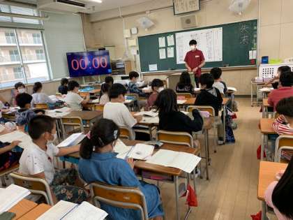 5月27日(木)5時間目、4年2組は国語で「ヤドカリとイソギンチャク」の読み取りをしていました。