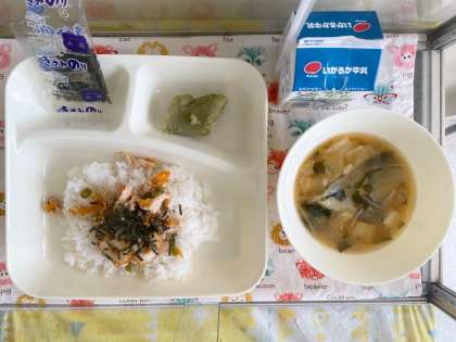 【かやくご飯、牛乳、みそ汁、まっ茶ういろう】