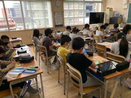 5月28日(金)1時間目、5年2組は家庭科で針と糸の使い方を学習していました。数名ずつ先生のまわりにあつまって、先生の手元を見て学習していました。