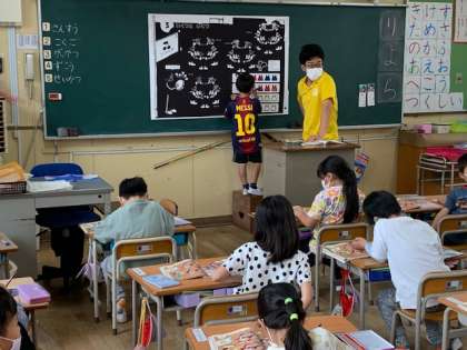 5月28日(金)1時間目、1年2組は算数で」「いくつといくつ」の学習をしていました。グループの中で赤と青がどのようにわかれたか色を塗って調べていました。