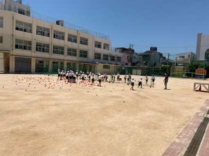 5月31日(月)3時間目、3年2組は運動場で体育をしていました。体力テストのボール投げの練習に玉入れの玉を使っていました。どこへ目がけて投げるとよいかの練習になったと思います。