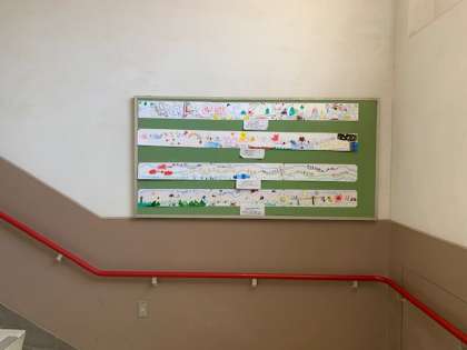6月1日(火)2年階段掲示板の作品が替わっていました。「クレヨンの町」「おまつりの町」「ふん火からにげろ」「いろんな生きものがおるおにわ」の絵が掲示されていました。クレパスの線を使った楽しい作品でした。