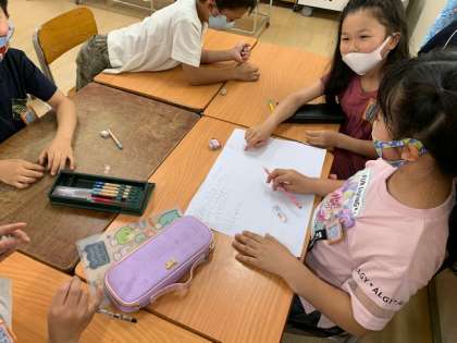 6月3日(木)3時間目、2年1組は学級活動で係活動について係で話し合って掲示物を作っていました。