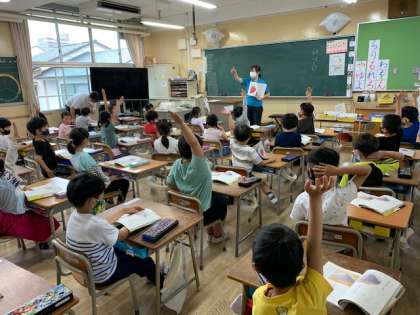 6月4日(金)1時間目、1年1組は国語で「さとうとしお」を「順番読み」していました。マルまで読んだら、次の人に交替します。友だちが読んでいるのを注意深く聞いていないとうまくいかないですね。慣れてくるとテンポよく読めるようになりますね。