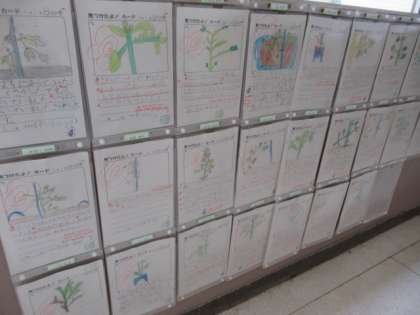 2年生は、ミニトマトを育てています。 子どもたちは、観察したことを観察カードに書いて廊下に掲示しています。
