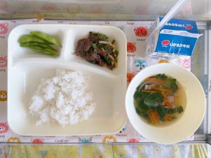 【ごはん、牛乳、チンジャオニューロウスー、ハムと野菜の中華スープ、えだまめ】