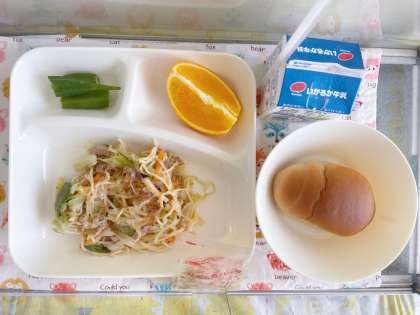 【牛乳、和風焼きそば、黒糖小パン、オクラの甘酢あえ、オレンジ】