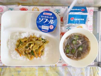 【牛乳、和風カレー丼、もずくとオクラのとろり汁、ヨーグルト】