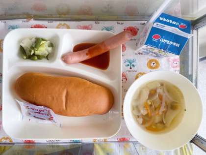 【コッペパン、牛乳、ウインナーのケチャップソース、スープ、キャベツとさんどまめのサラダ、いちごジャム】