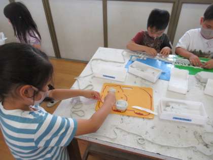 子どもたちは、粘土をできるだけ長くのばして、迷路を作ったり、道や線路を作ったりしていました。