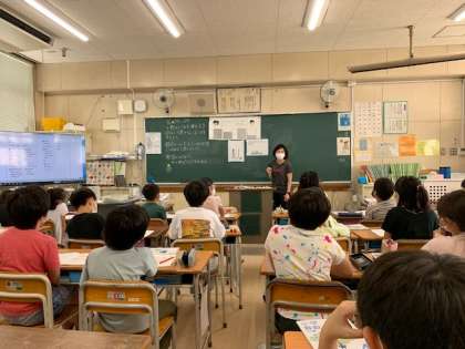 6月21日(月)3時間目、4年生は算数で習熟度で学年を3分割して学習していました。4年1組に集まったのは「ひょうたんチーム」というなまえだったように思います。「小数のしくみを考えよう」という単元で、今日は0.1を10個分けた1つ分を0.01と表すことを学びました。