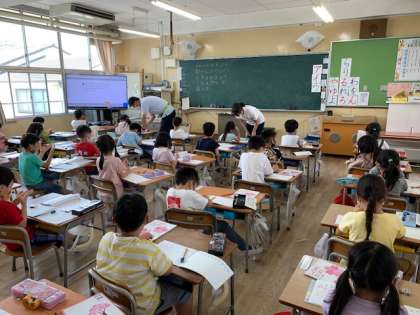 6月23日(水)4時間目、1年1組は算数で「ぜんぶで いくつ」という学習をしていました。