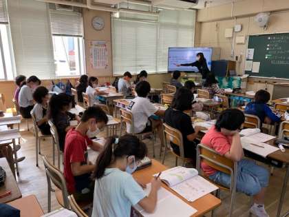 6月24日(木)1時間目、5年1組は算数で小数のわり算であまりのある筆算のしかたを考えていました。