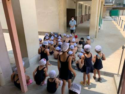 6月24日(木)4時間目、1年生が明日のプール開きに向けて水着への着替えの練習をしていました。