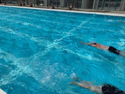 7月5日(月)5時間目、6年2組は体育で水泳をしていました。クロールで25m、50m、100mと目標を決めて、それぞれチャレンジしていました。さすが6年生は100mも泳ぐのですね。