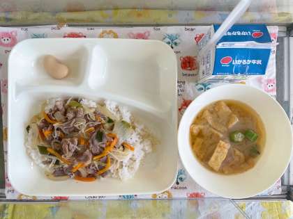 【牛乳、牛丼、とうがんのみそ汁、白花豆の煮もの】