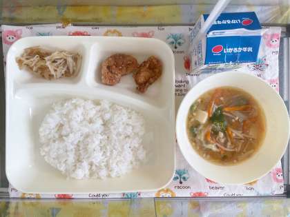 【ごはん、牛乳、豚肉の香味あげ、みそ汁、もやしのおひたし】