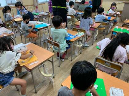 7月9日(金)4時間目、1年2組は学級活動の後、ねん土で遊んでいました。おいしそうなどら焼きを作っている子がいました。