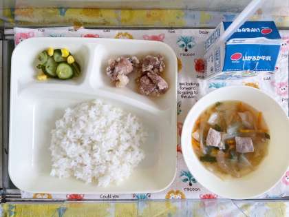 【ごはん、牛乳、鶏肉のからあげ、中華みそスープ、きゅうりとコーンの甘酢あえ】
