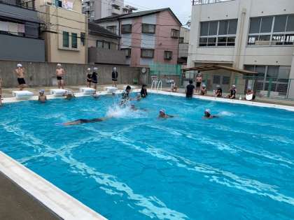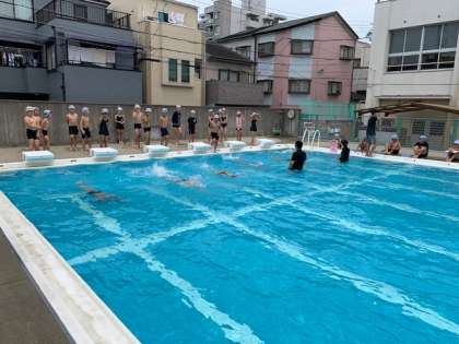 7月12日(月)3時間目、4年2組はプールで面かぶりクロールの練習をしました。プールを縦に泳ぐ人と横に泳ぐ人がぶつからないようにしながら、自分に合わせて練習していました。