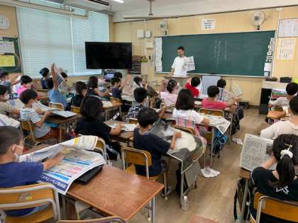 7月13日(火)1時間目、3年2組は書写で、新聞紙を折ったりして準備をしていました。