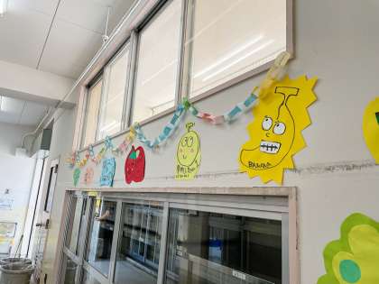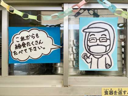 いつもおいしい給食を提供してくださっている給食調理員のみなさんが、子どもたちにためにと、給食室をきれいにかざりつけてくださいました。子どもたちは、「いつもありがとうございます」とあいさつができていました。