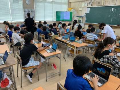 7月13日(火)1時間目、4年1組は総合的な学習の時間で、パソコンの使い方を学習していました。ICT支援員という先生が来られていましたので、パソコンについてわからないことを聞きながら学習した子が多いと思います。