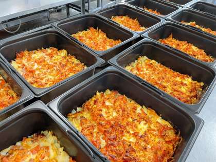 【黒糖パン、牛乳、鶏肉とてぼ豆のスープ煮、じゃがいもとトマトのチーズ焼き、きゅうりのサラダ】