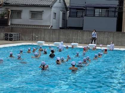 7月15日(木)2時間目、2年生はプールで水あそびをしていました。水中でじゃんけんをして、どちらかが相手のまたの下をくぐることをしていました。じょうずにもぐれたかな?