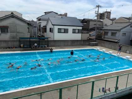 8月26日(木)4時間目、4年2組は体育でプール水泳をしていました。水慣れで浮く練習をしていました。