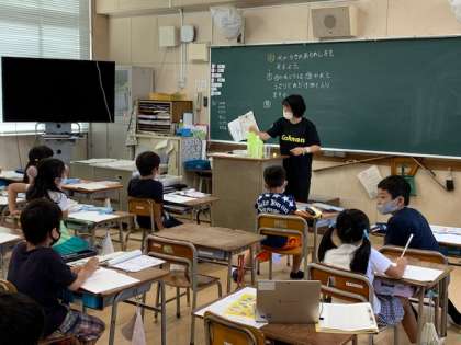 8月27日(金)1時間目、2年2組は算数で「水のかさのあらわし方を考えよう」というめあてで学習していました。2つのペットボトルに入った色水の量を比べているように見えました。