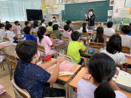 8月30日(月)2時間目、4年1組は音楽で民謡をがくしゅうしていました。リズム打ちをしていました。先生の後に続いて上手にできていました。